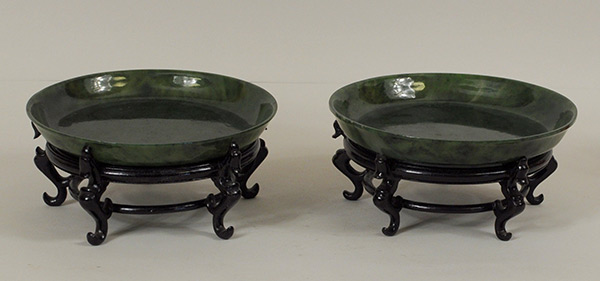 A Chinese carved mutton fat jade vase on wood stand, 2 3/8" high, 2 1/2" wide, sold to a phone bidder for $5,250, and a pair of Chinese spinach jade footed bowls on stand, 1" high, 7 1/4" diameter, fetched $1375 from an internet bidder.